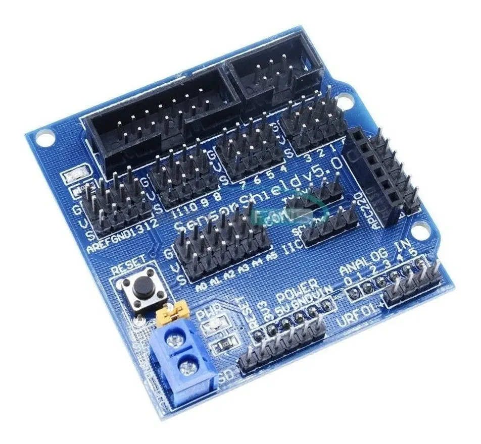 Este Sensor Shield V5.0 está diseñado para facilitar la conexión entre sensores, módulos y actuadores con las placas Arduino UNO, Mega 2560 y Leonardo, eliminando la necesidad de soldaduras o cables complicados.